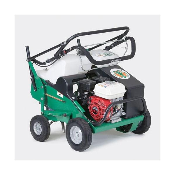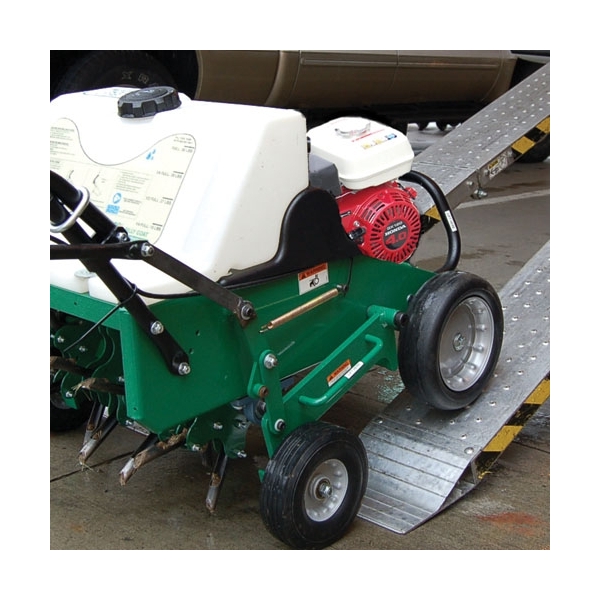 Additionally, the AE401 also eliminates bulky steel weights, in favor of a simple to use water weight positioned directly over the tines for better aeration depth. The unit features the industry’s softest tine engagement and exclusive Lift N Lock™ disengagement for best in class comfort and productivity. After use and during transport, tilt up serviceability, removable tine stars, and Fold-n-Go™ handles, and easy adjust drive chains make service and transport convenient and simple.