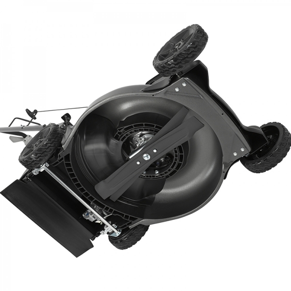 The 21-inch curvilinear mower deck, designed for optimized airflow, is composed of heavy-duty steel to stand up to the most rugged conditions. The deck has been designed to produce an efficient path for grass clippings to pass into the bag or onto the ground when mulching. The efficient pathway improves bagging and mulching, preventing grass clippings from clogging.