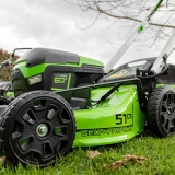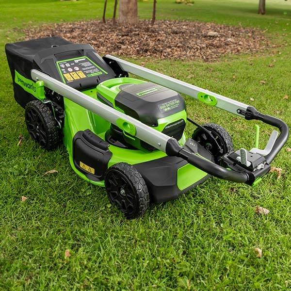 Features a dual battery port with auto switch over, rear wheel self-propelled drive system with variable speed control, a high efficiency brushless motor with push button start, turbo function for tougher grass and improved lift when needed, Smart Cut technology (which automatically adjusts the blade speed to meet cutting conditions), on board LED indicator, easy fold aluminium handle and single lever height adjustment for the perfect cut.
