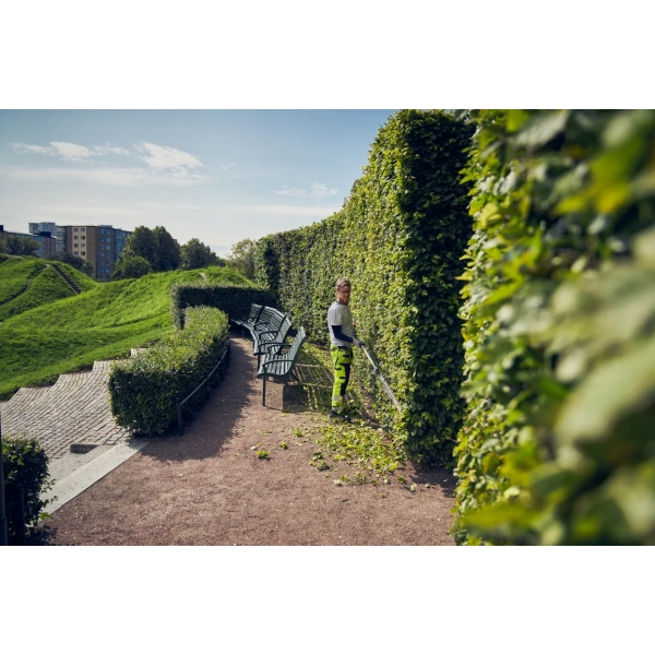 Husqvarna 525iHE4 is a high-capacity, battery-powered pole hedge trimmer with up to 4 meters reach, designed for professional use. The 60cm adjustable cutter bar, equipped with triple grinded knives, offers high cutting speed for high productivity when cutting high, wide, or low hedges. The cutter bar also folds easily to facilitate transport and storage. Well-balanced design, low vibration level, ergonomic handles, and intuitive user interface enable comfortable use during long and demanding working hours. IPX4 standard for all-weather use and an active battery cooling system ensure high uptime. Integrated connectivity for easy connection to digital services such as Husqvarna Fleet Services™. Battery and charger are not included.