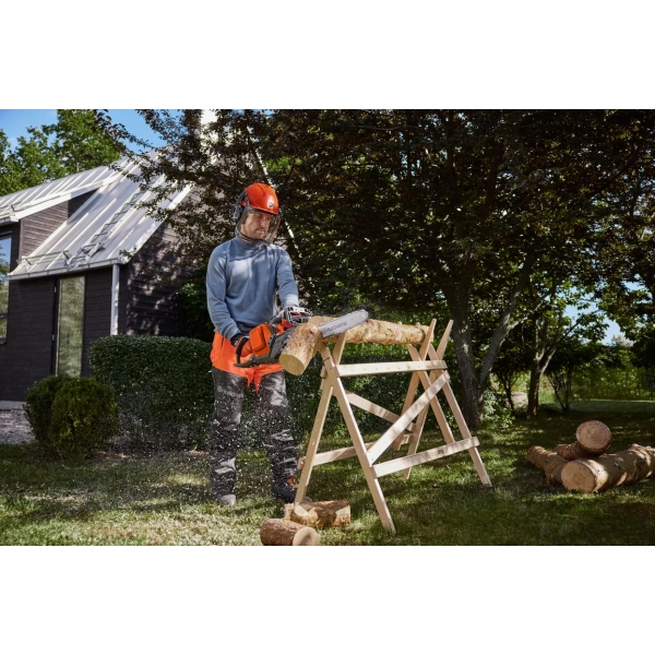 The battery-powered Husqvarna 240i chainsaw has been developed to provide high power and ease of use. Work can be done comfortably and ergonomically thanks to the compact, lightweight design. When cutting firewood or felling trees in the garden, the Max Torque Technology will ensure reliable power and minimise the risk of the chain getting stuck in the wood. The user experience is also improved by the user-friendly keypad with on/off button and the well-balanced saw body. Battery removal is facilitated by the fact that the battery is positioned horizontally through the machine, reducing the risk of dirt and chips entering the battery compartment. 240i is a part of Husqvarna's flexible 36V system BLi-X, allowing one battery to be used for several tools. Includes upgraded BLi200 battery and 40-C80 charger.